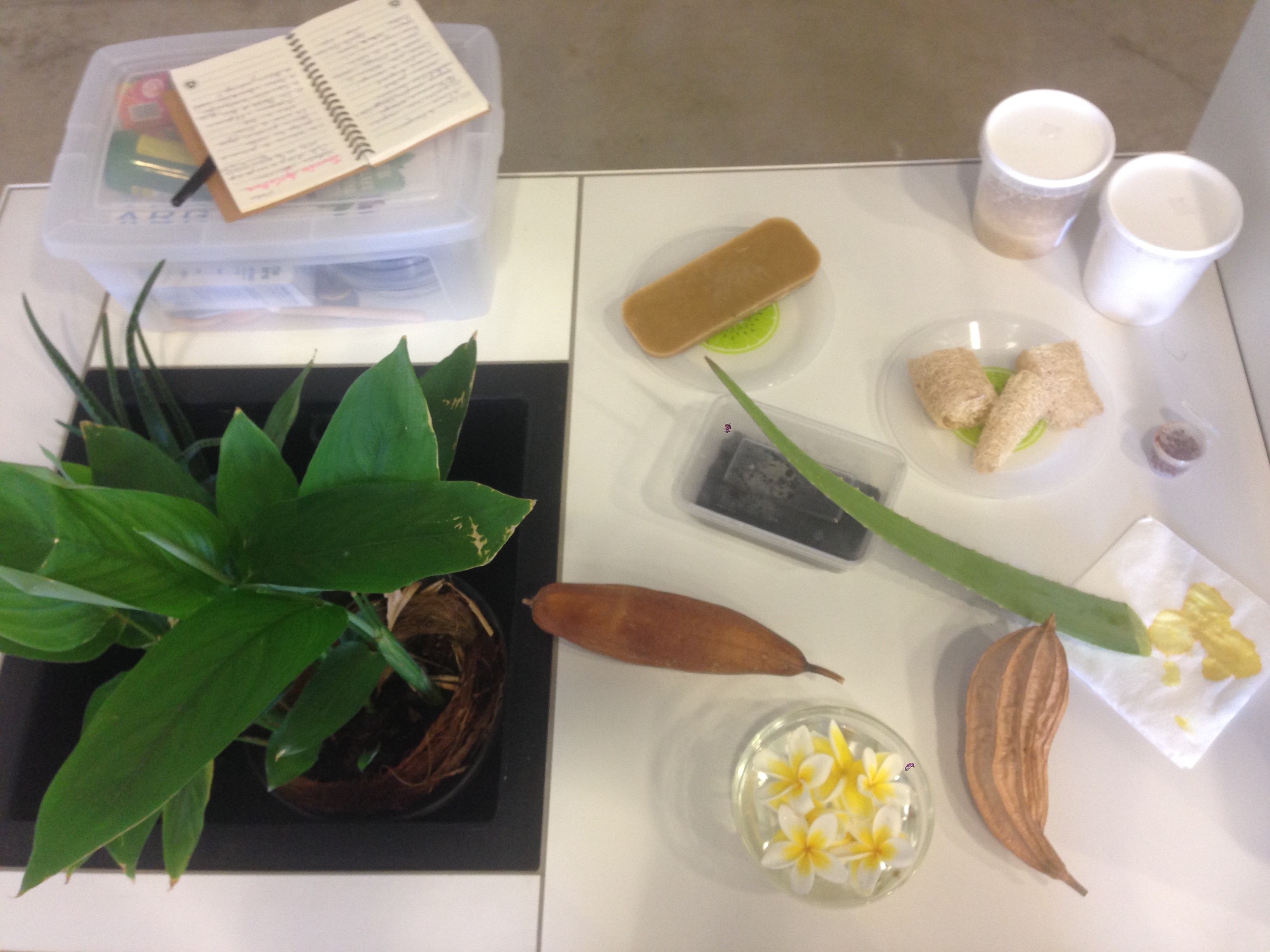 Enfin, portez attention aux plantes locales qui ont un intérêt cosmétique ou ménager… Tabac bœuf riche en saponine, pipangaille lisse pour une fleur de douche gommante, aloe vera pour l’hydratation de la peau, arrow-root pour les masques du visage, hydrolat de géranium en tonique ou démaquillant ainsi que le miel et la cire d’abeille dans de nombreux mélanges.